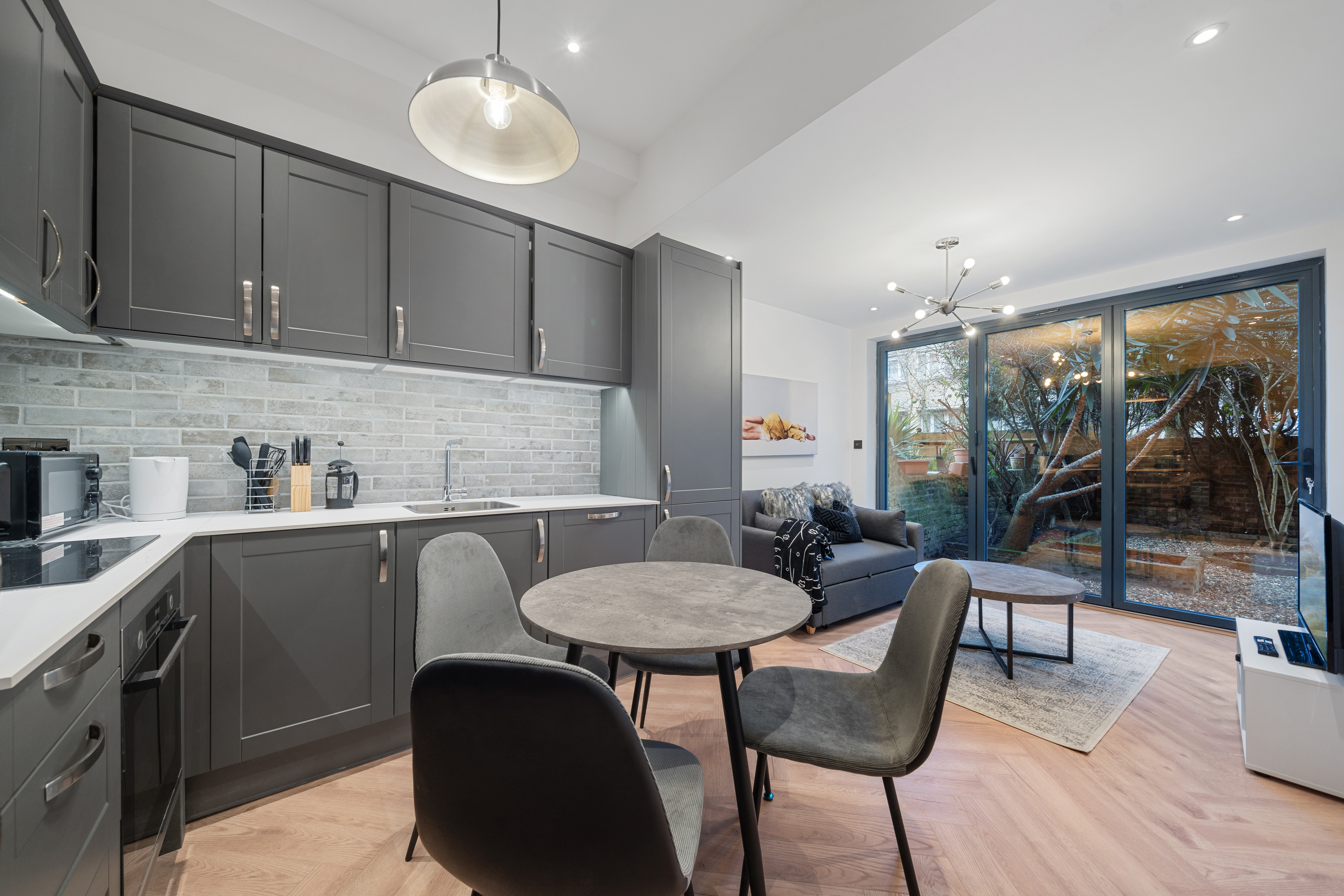 A hugely impressive and meticulously refurbished two bedroom, two bathroom garden apartment benefiting from a utility room and study room.